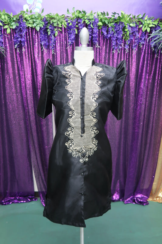 3/4 Puff Sleeve Barong Dress - Beige/Black 2