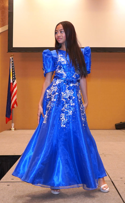 Royal Blue Mestiza Satin Gown w/ 3D Lace
