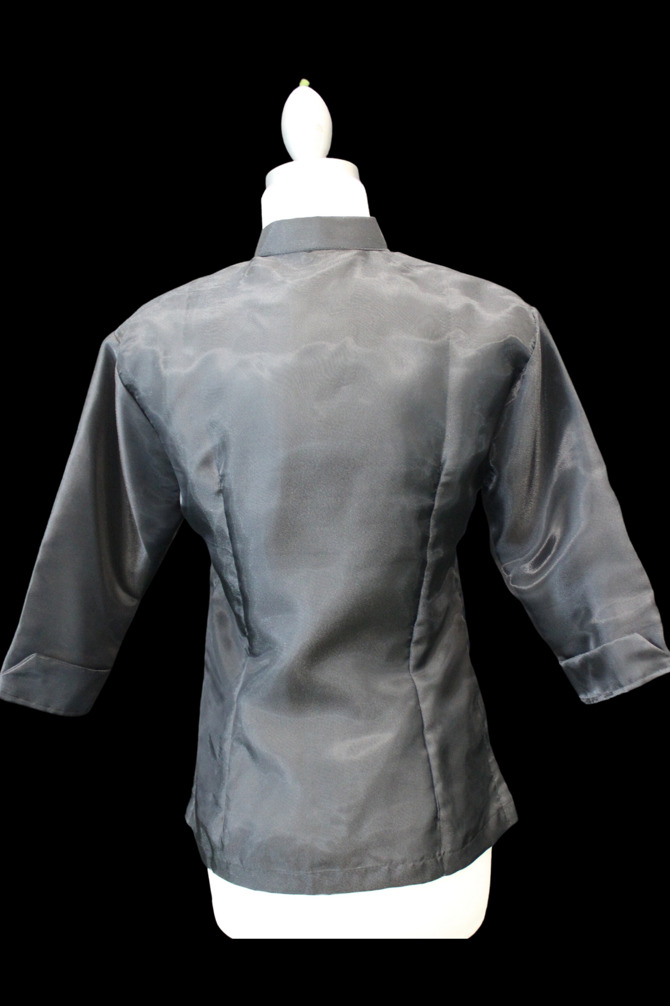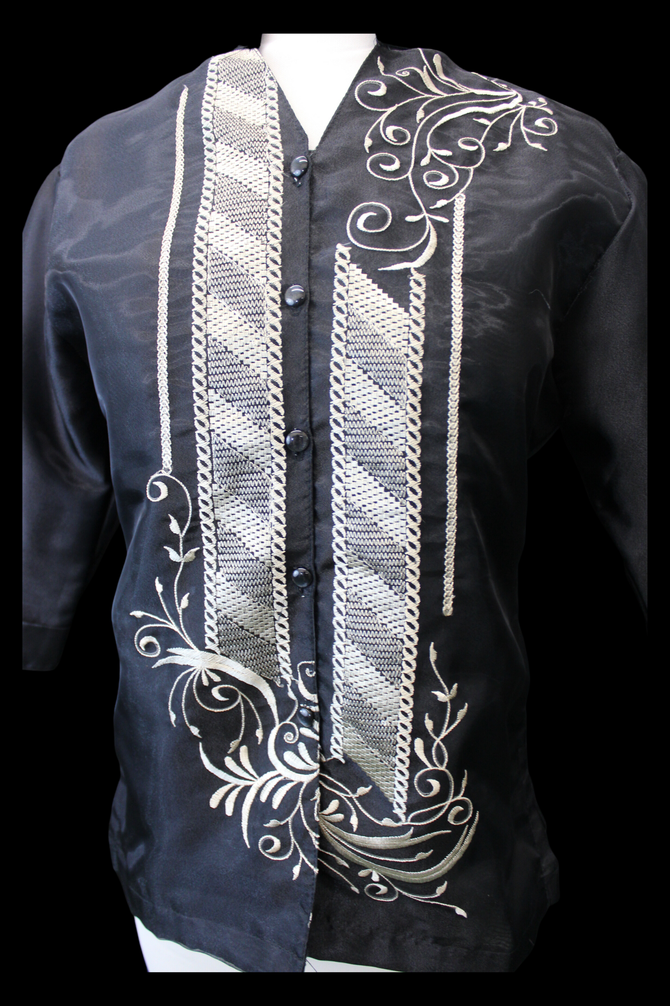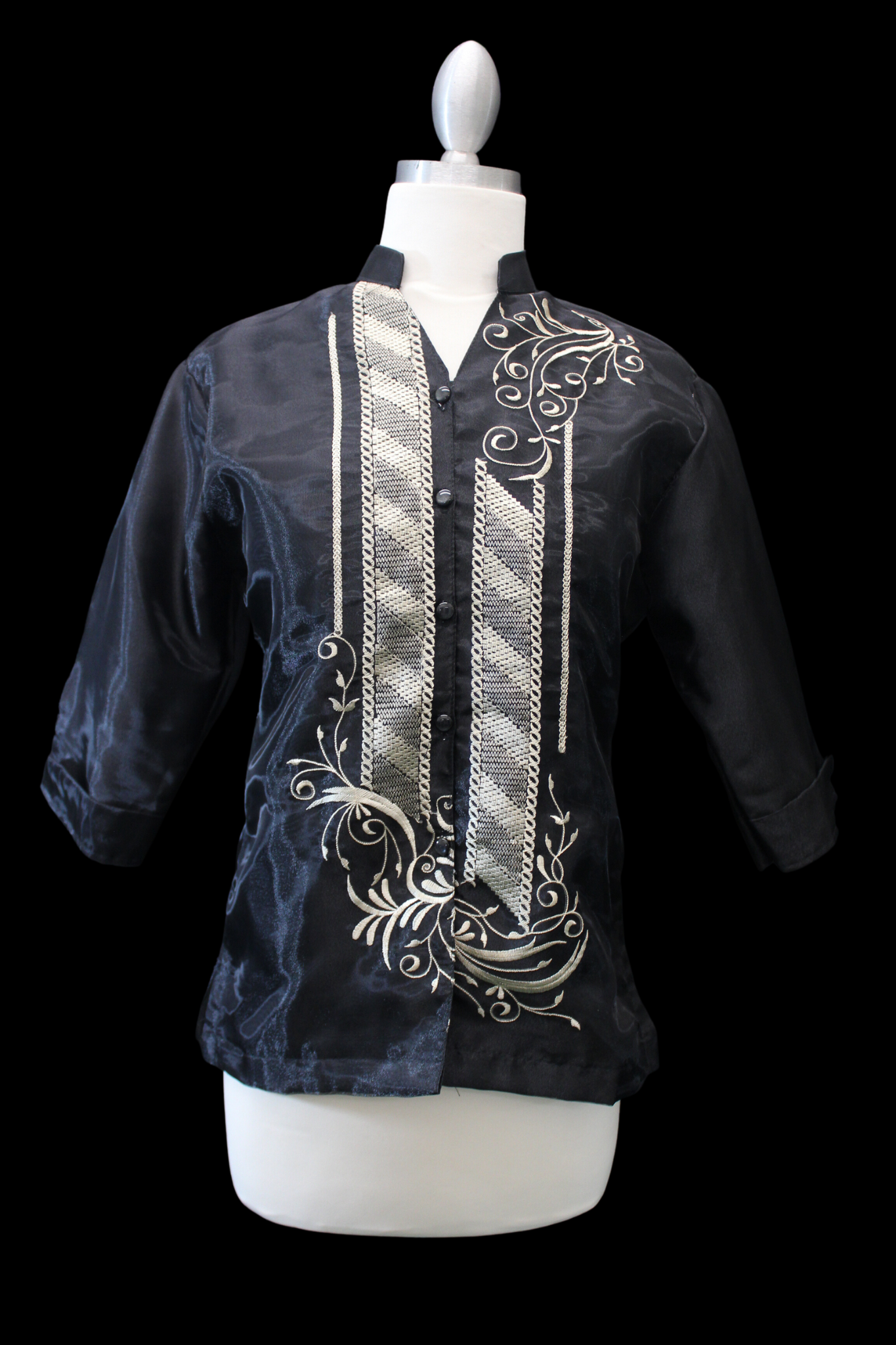 A 3/4 Sleeve blouse is perfect for your casual and semi-formal events! Made out of a black organza fabric and detailed with mocha embroidery. This is our simple version of a filipiniana without the butterfly sleeves.
