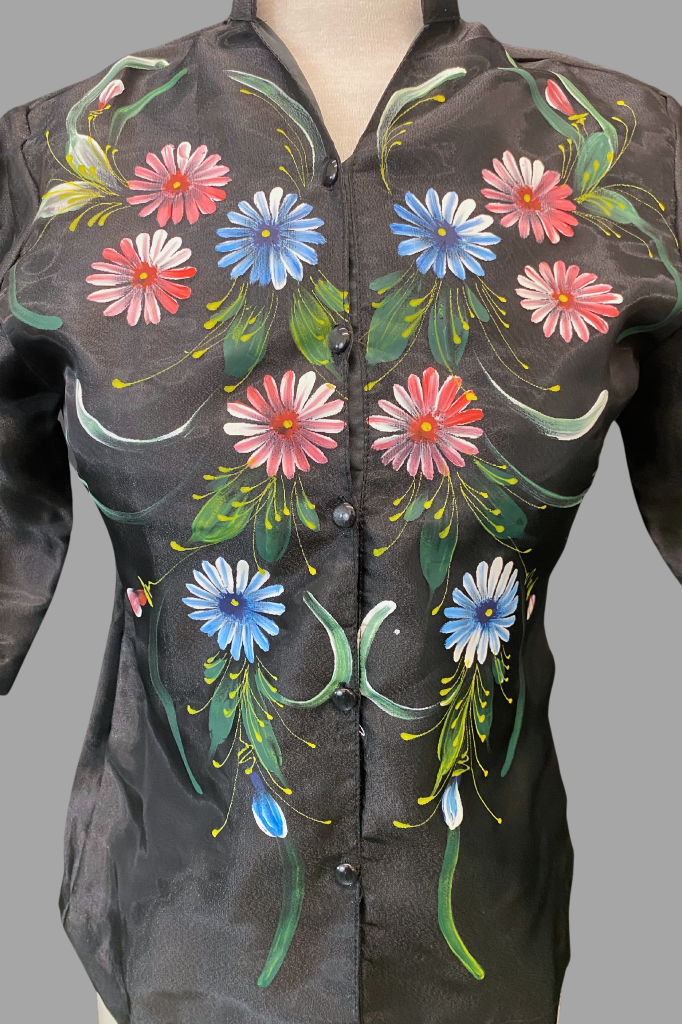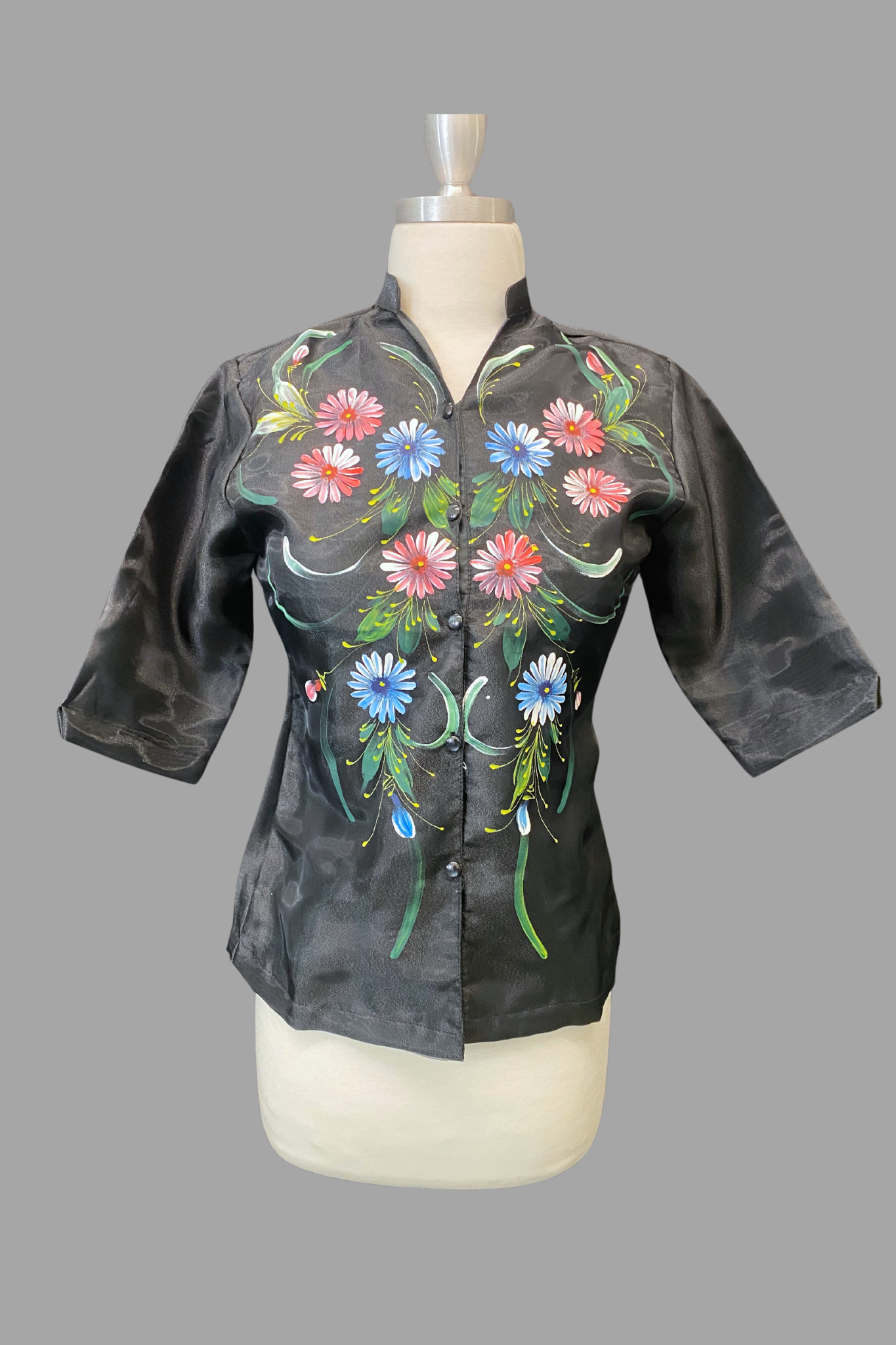 3/4 Sleeve Hand Painted Barong Blouse - Black