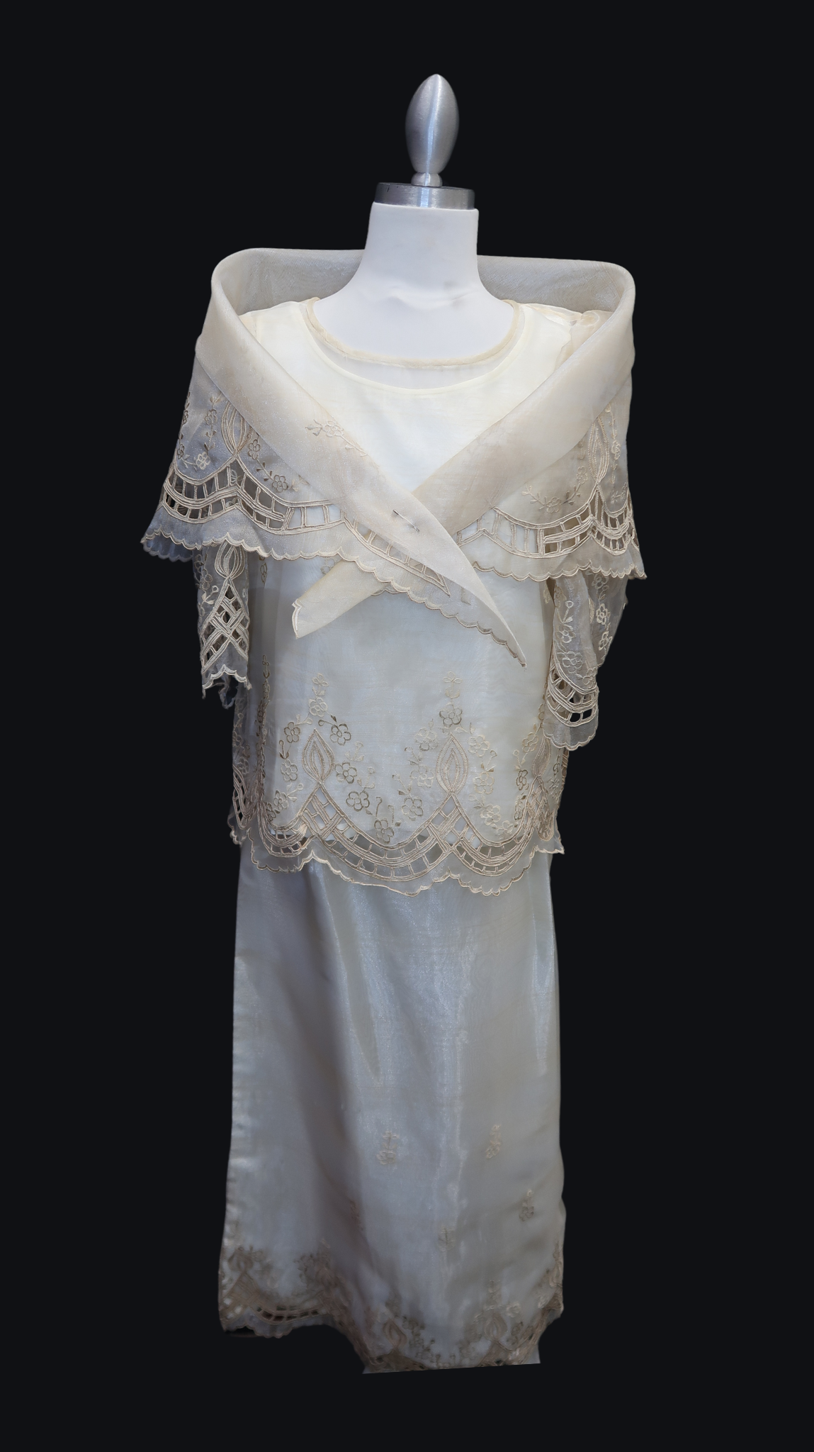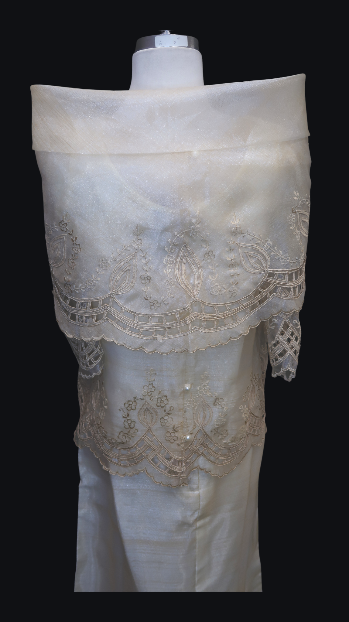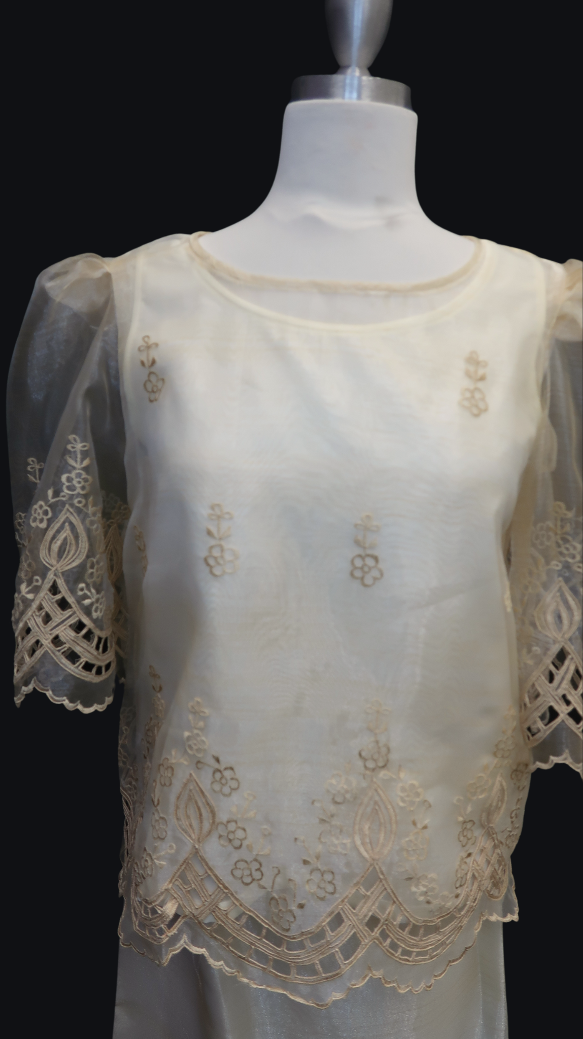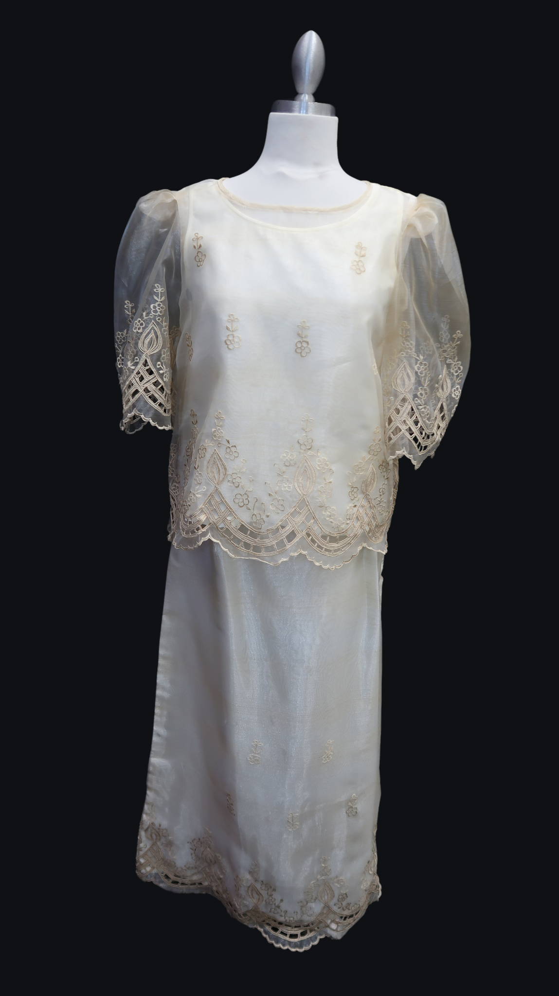 Set includes blouse, skirt, and matching alampay (ring/brooch not included). Cutout detailing and embroidered throughout outfit. The bell sleeve is a easier style for those who are not a fan of butterfly sleeves. Skirt is a midi length.
