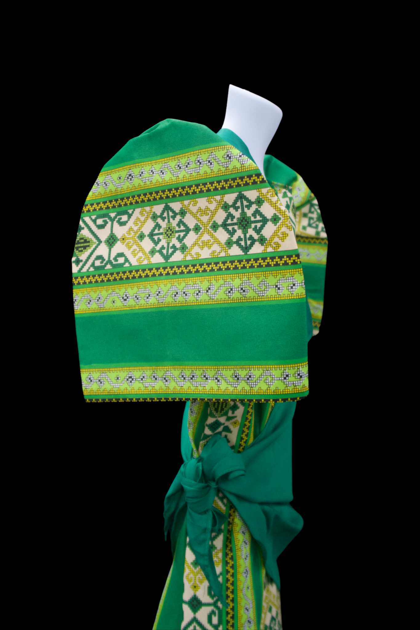 Dress comes with matching tapis (wrap) and shoulder sash.