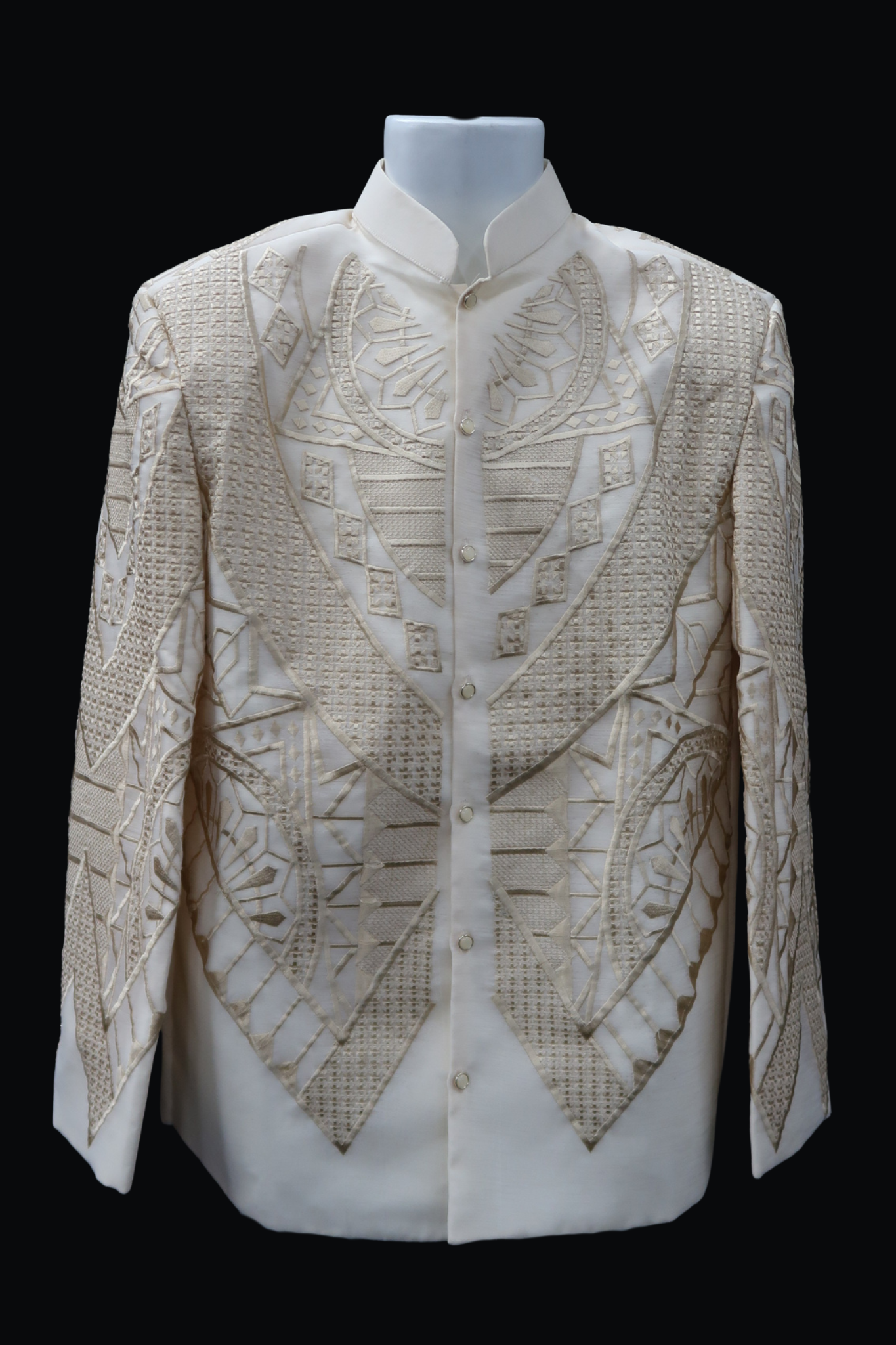 The Haligi Coat Barong features bold, dimensional embroidery that forms a striking architectural pattern across the chest, extending seamlessly onto the shoulders, back, and sleeves. The intricate embroidery creates a sculptural effect — almost three-dimensional — giving the garment remarkable depth, texture, and movement as light meets each detail.