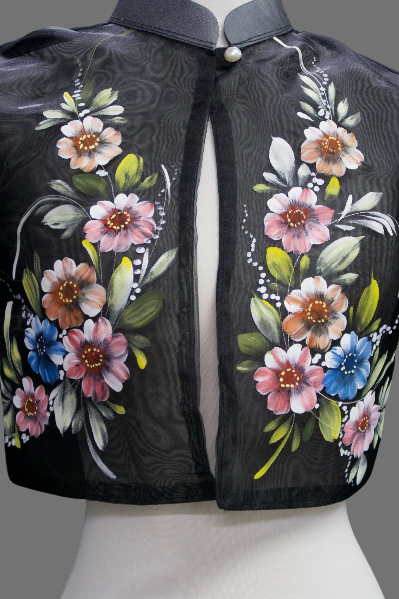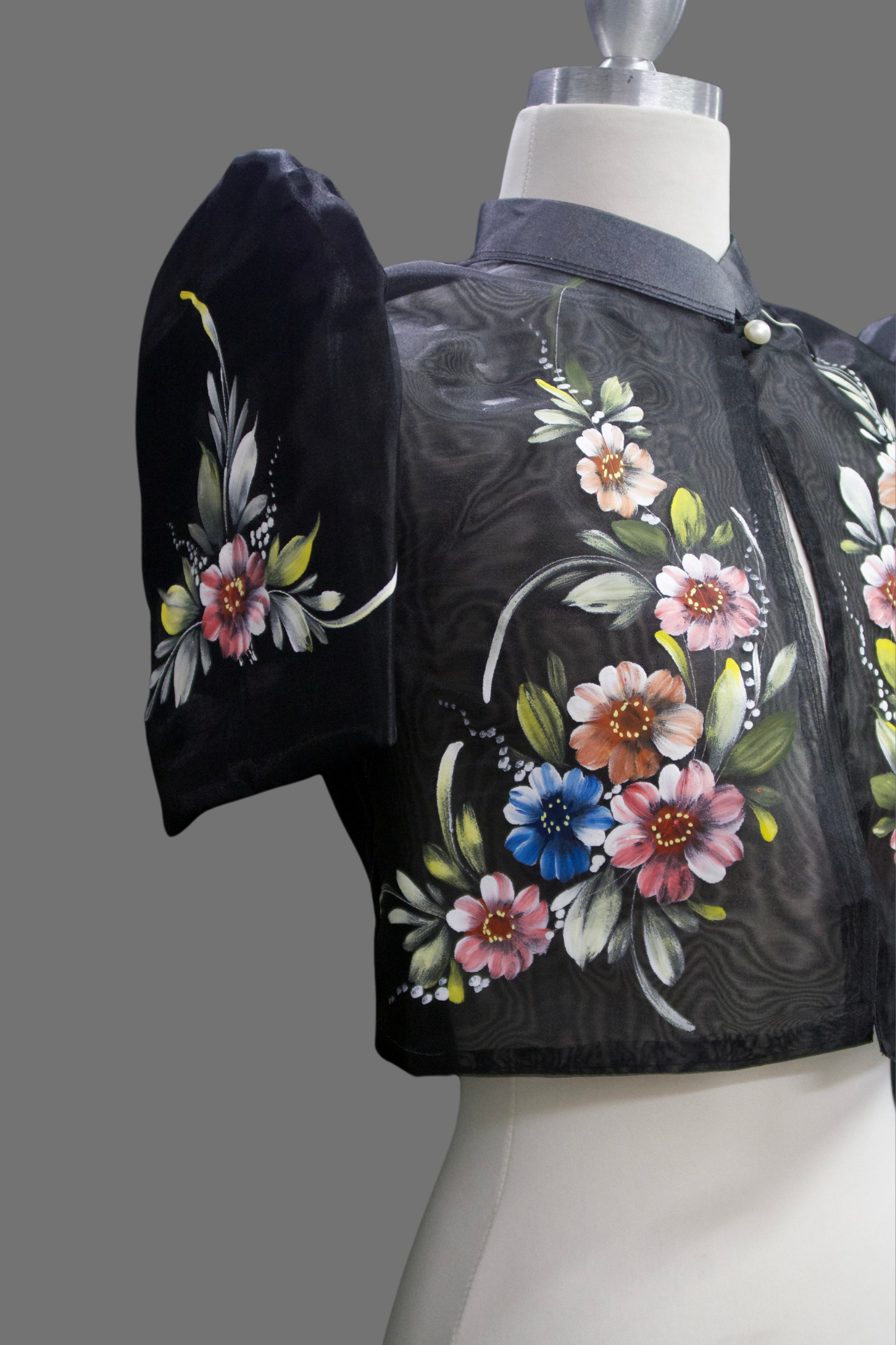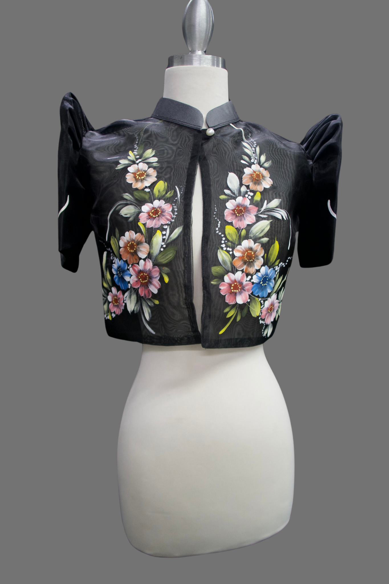 Welcoming the debut of our hand painted single button bolero! The vibrant colors of the flowers and painting make a beautiful statement against the black fabric. Aside from this modern style bolero, you will be proud to wear the purely hand painted design from our talented team in the Philippines.