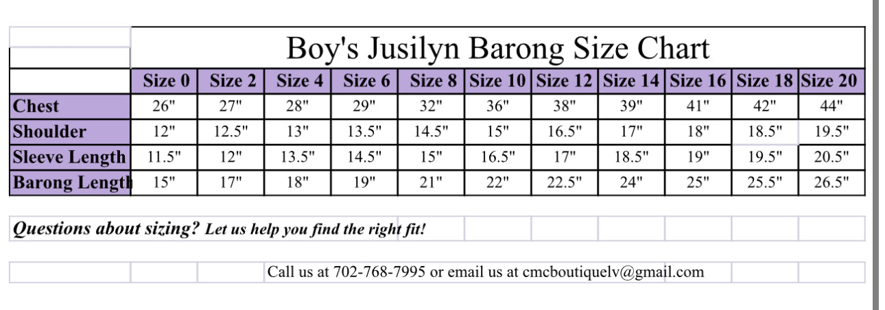 The Jusilyn Barong is a our most budget friendly yet traditional style Barong. Perfect for one time use or for those looking for a affordable style. Now offered in kids sizing, the entire family can be matching in their barongs!