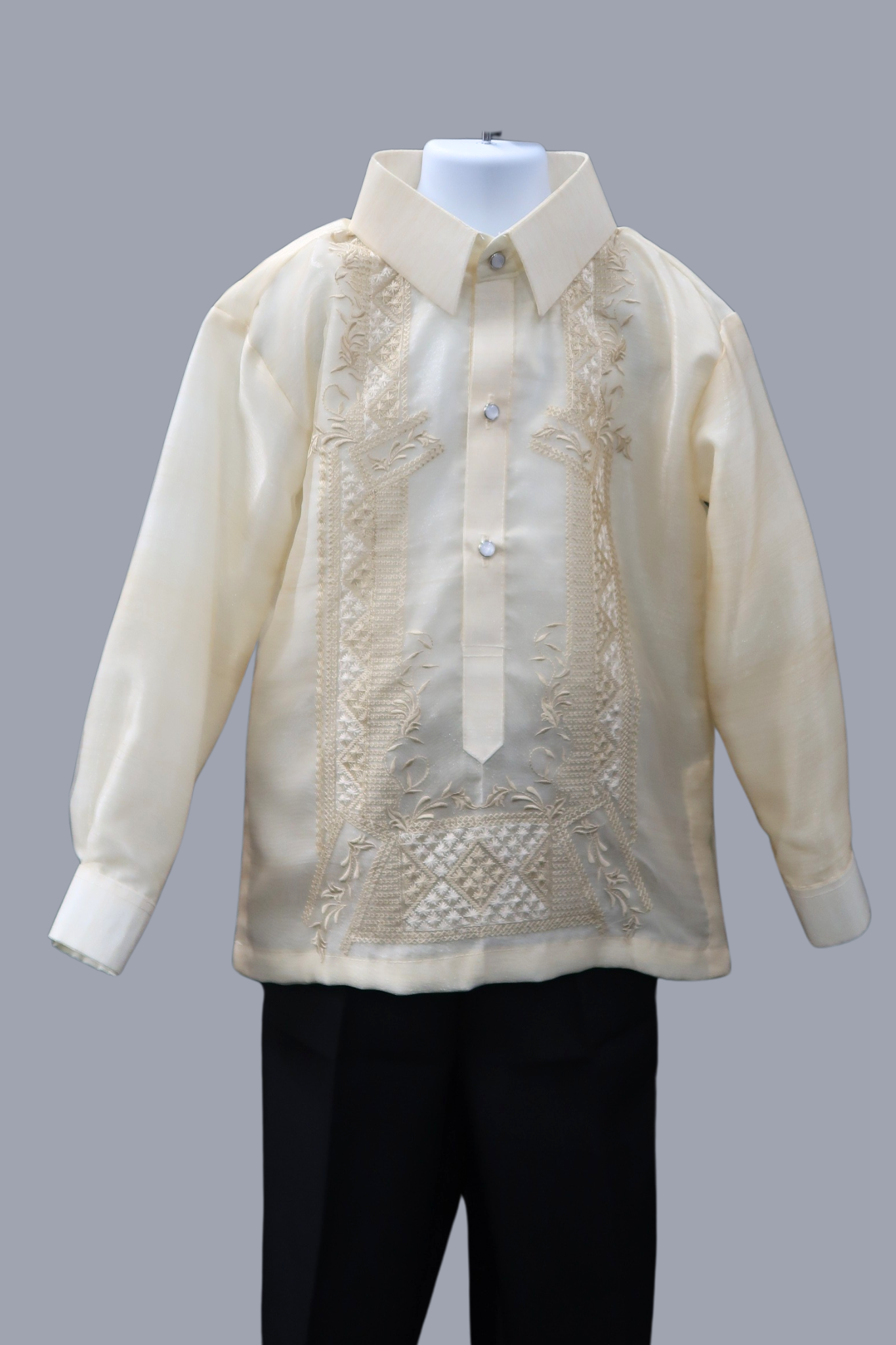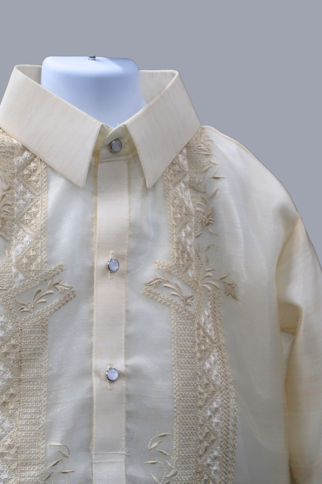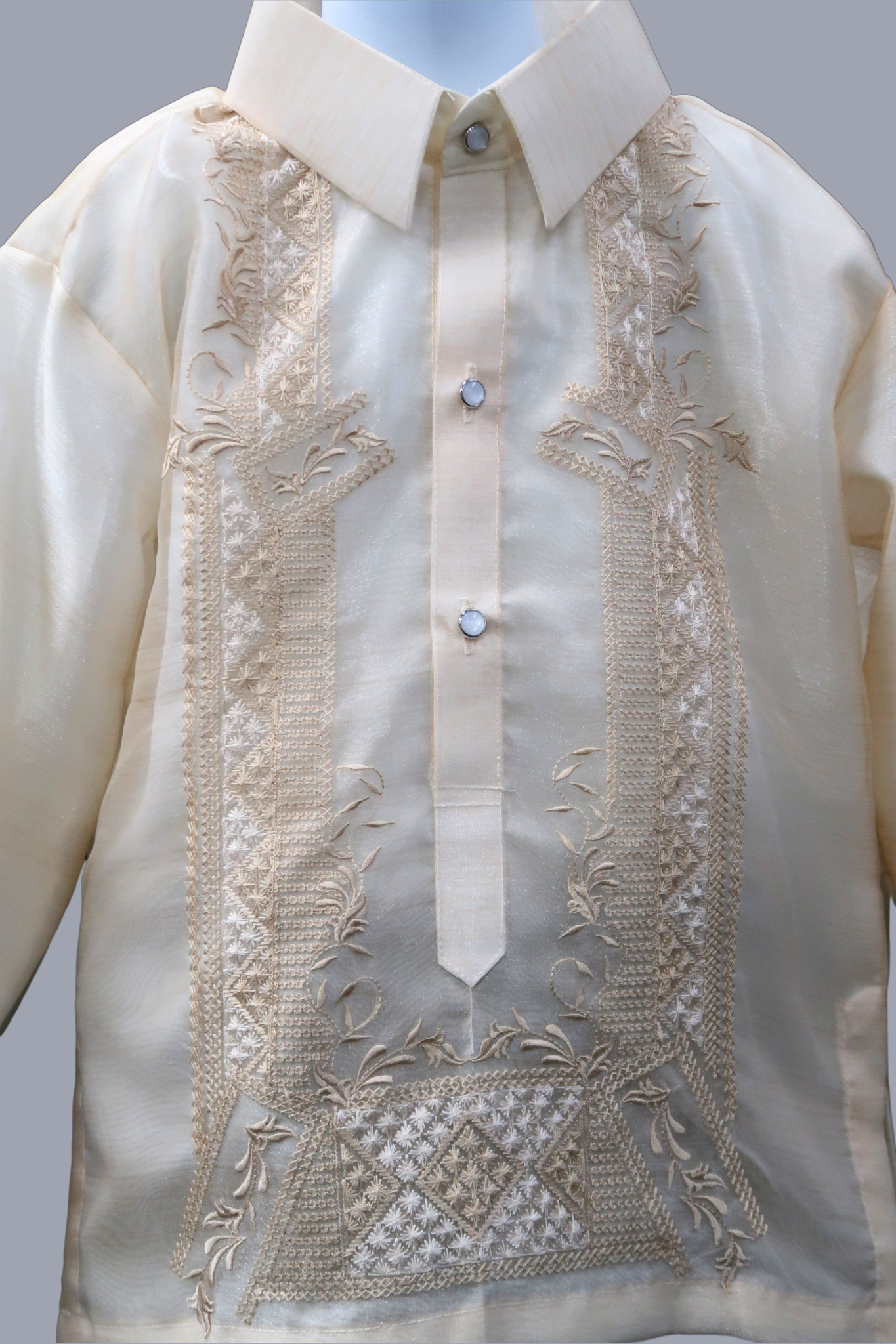 Can't forget about the little ones! Kids Barong Tagalog in a beige pina organza fabric with elevated silver pearl buttons. Perfect to match with our adult barongs.