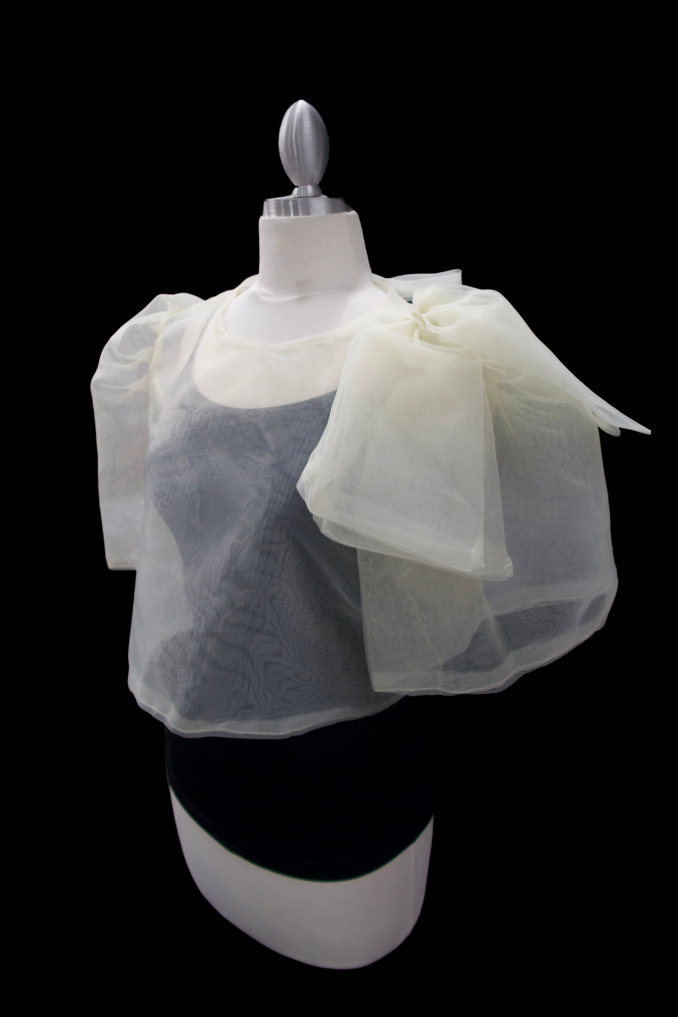 NEW to our collection is the Mara Filipiniana Blouse! This organza blouse is a one size fits all style, due to the open back with tie closure making it easy to adjust to any size. The cropped fitting and big bow detailing gives a modern style and makes it easy to pair with a skirt, over a dress, or with pants.