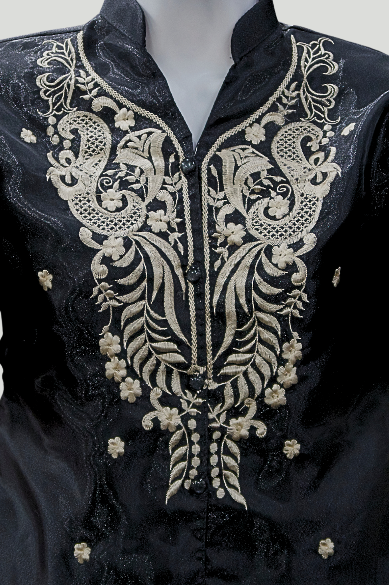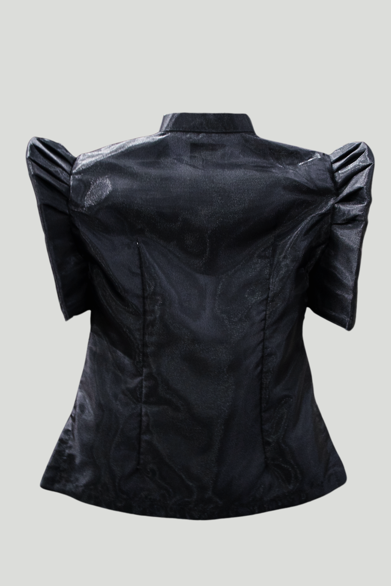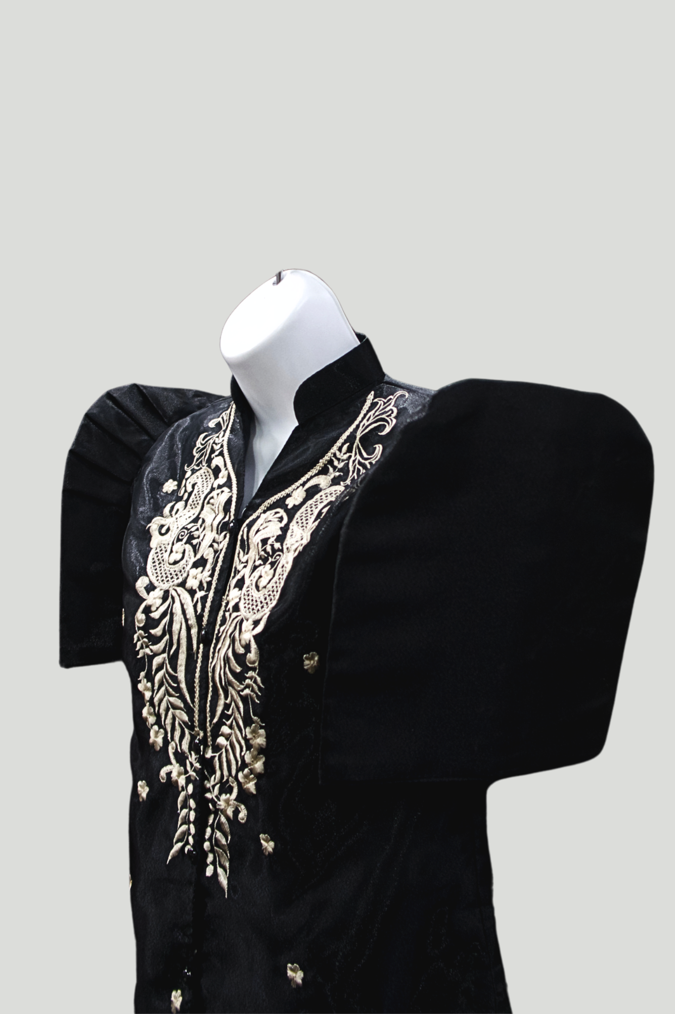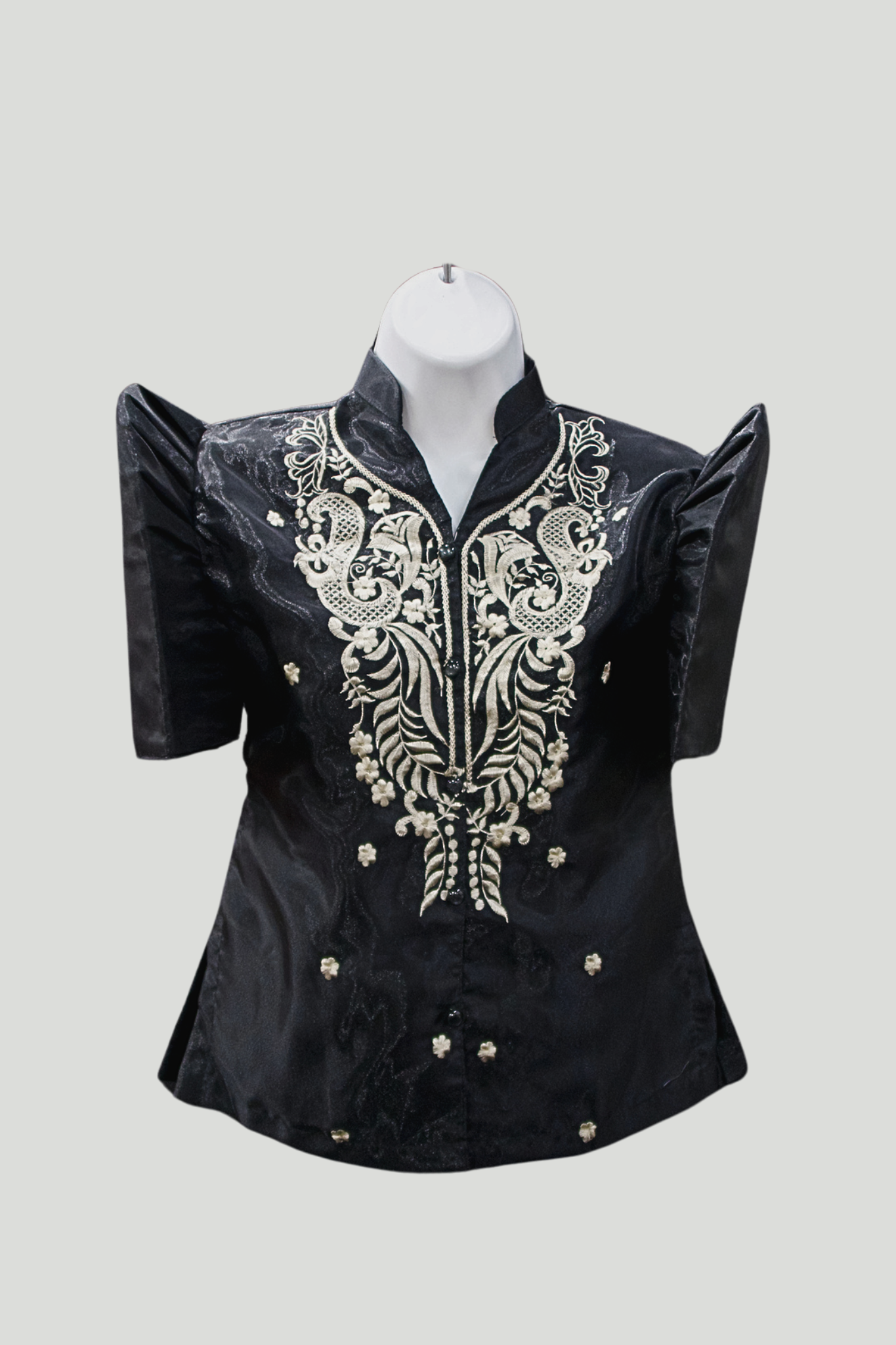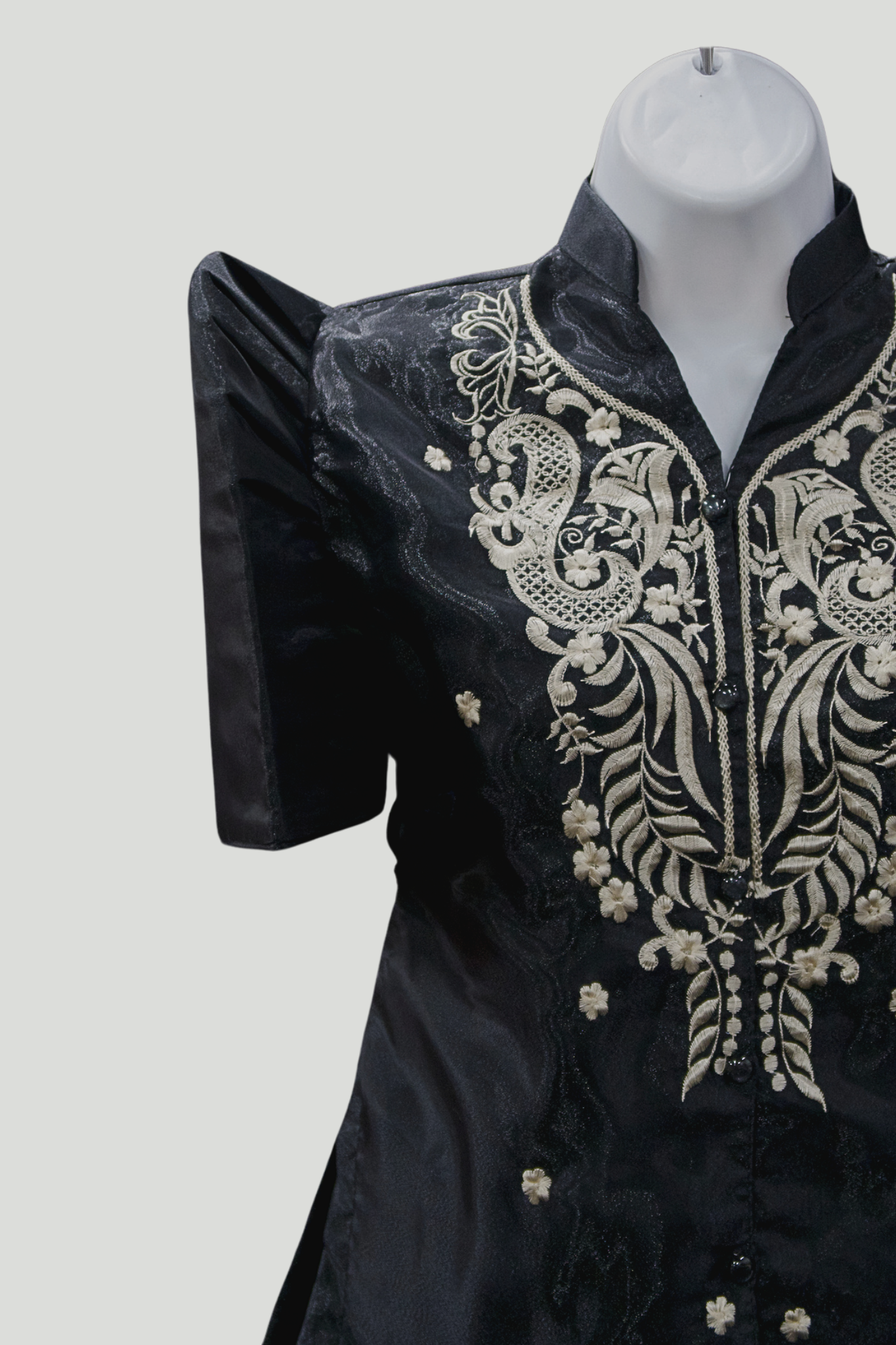 Indulge in the elegant and exclusive Mestiza Barong Blouse in Black. The Filipiniana version of the barong boasts butterfly sleeves and intricate embroidery, while its hip-length allows versatile styling for both business and formal occasions.