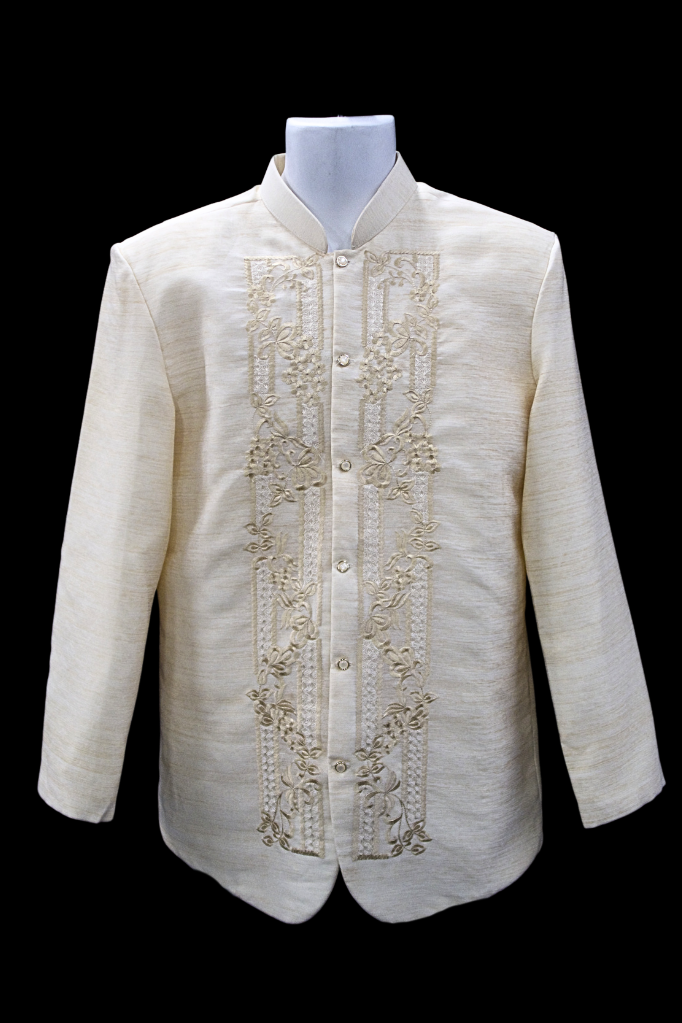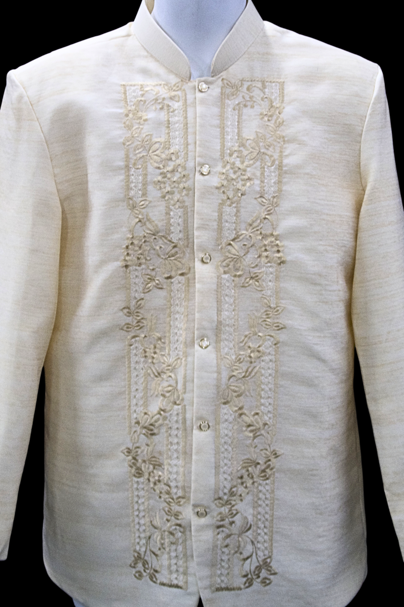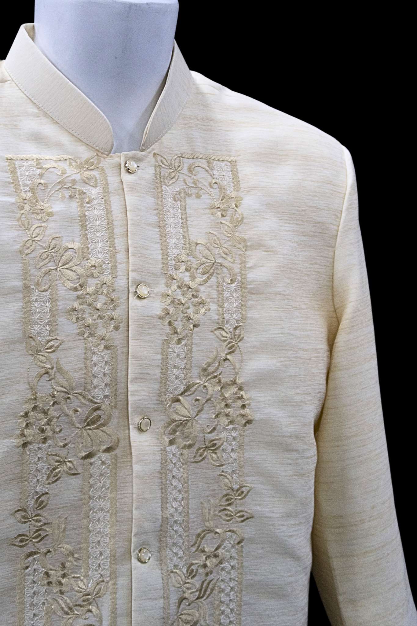 Elevate your formal wardrobe with the Mocha Benusha Coat Barong - Piolo. Crafted from luxurious Benusha silk, reminiscent of our Jusilyn fabric, this light tan coat features a full button-down design adorned with elegant gold pearl buttons. Its triple-layered construction offers a refined silhouette and exceptional comfort, making it the perfect choice for distinguished occasions.