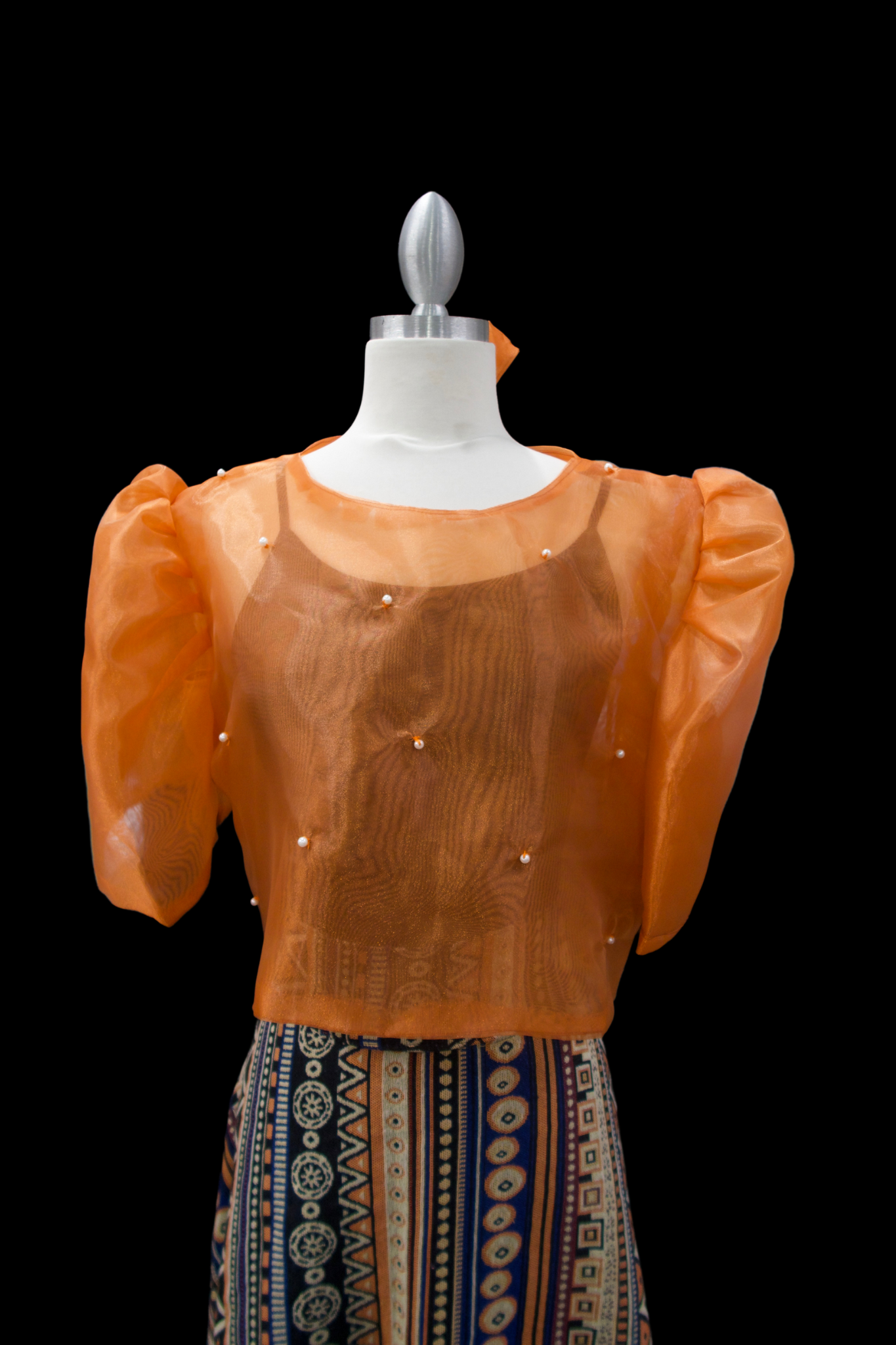 Take your outfit to the next level with this new flowy style Filipiniana cropped blouse. The scattered pearl detail, tie closure and open back design gives this top a very delicate yet feminine feel. Pair with jeans for a casual look, over a dress for a formal feel, or with wide leg pants for a business style, the possibilities are endless.