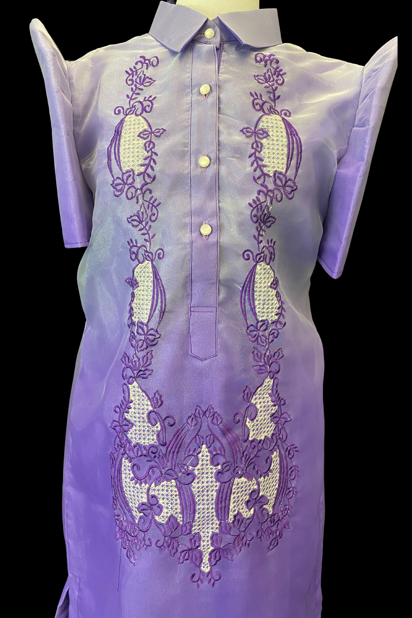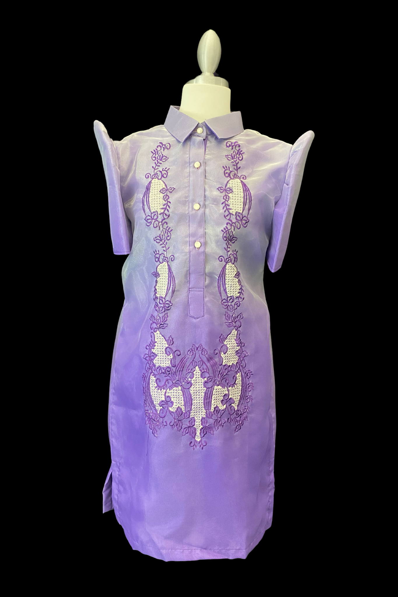 Just like the men's barong tagalog, the barong dress replicates all the characteristics of the barong but in a feminine adaptation. This purple barong dress is rich in color and heritage. A great choice for cultural celebrations, weddings, corporate events, and much more.