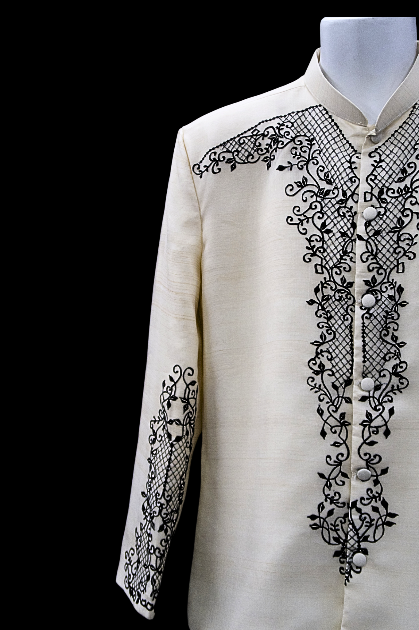 The structured fit and mandarin collar give this piece a clean, tailored silhouette, while the rich black detailing against the natural ivory tone evokes both heritage and refinement. Whether worn to weddings, formal galas, or cultural celebrations, the Batok brings timeless elegance to every entrance.