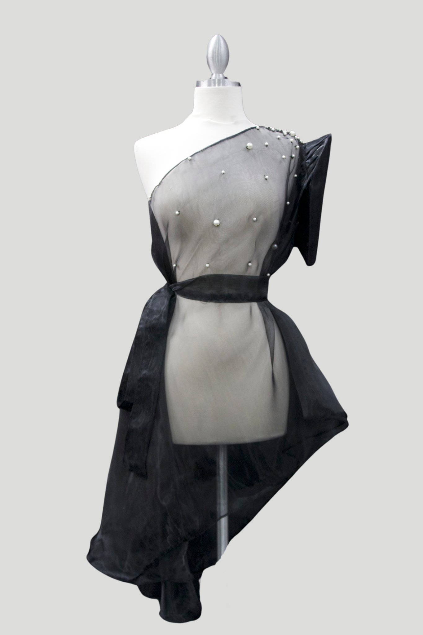 This beautiful sheer, one shoulder top is made from an organza material and features a scattered hand sewn pearl design through the blouse. Due to the open layout of this blouse, it allows for a free sizing fit, which can fit all body shapes from sizes small to 3XL. The included belt can be used to your liking and styling, but we encourage you to use your own accessories as well for a unique look!